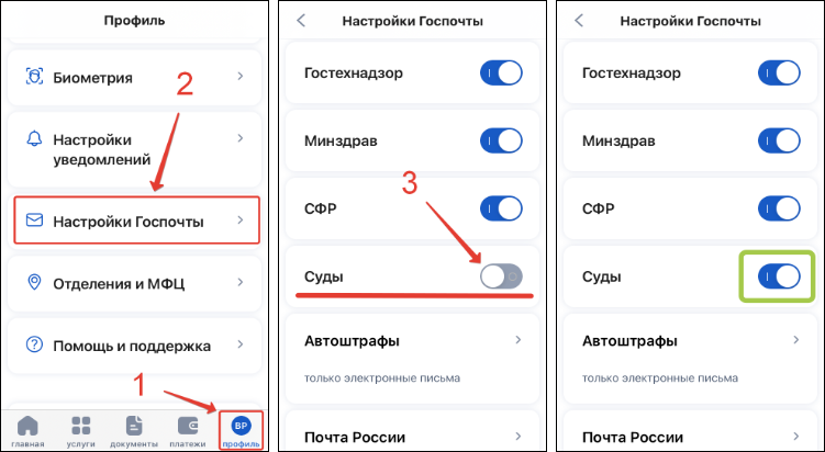 Откройте «Настройки Госпочты» в мобильном приложении «Госуслуги» и установите переключатель в строке «Суды» в положение «включено»: